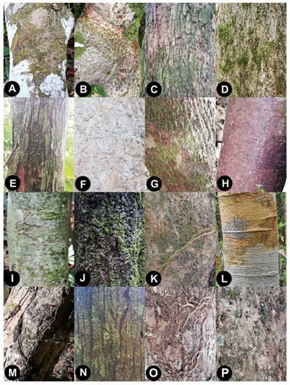 Types of bark texture of host plants in undisturbed and disturbed forests in Peninsular Malaysia: (A) Type 1, (B) Type 2, (C) Type 3, (D) Type 4, (E) Type 5, (F) Type 6, (G) Type 7, (H) Type 8, (I) Type 9, (J) Type 10, (K) Type 10, (L) Type 11, (M) Type 12, (N) Type 13, (O) Type 14, (P) Type 15.