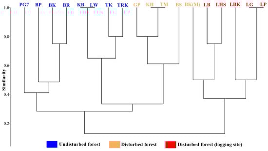 Samplings were conducted between November 2016 and April 2021 in 18 different localities in Peninsular Malaysia (Figure 1). The systematic sampling involved choosing exploration sites in Peninsular Malaysia. We collected information on each of the site conditions (e.g., area, vegetation type, elevation, disturbance regime, and disturbance origin) (Table 1 and Table 2). Major disturbances were classified as either natural or anthropogenic in origin. To disentangle the effects of anthropogenic and natural disturbance regimes, there were two main forest types varying in vegetation: undisturbed (Table 1) and disturbed (Table 2) forests, with several subsidiary study sites, eight undisturbed and ten disturbed forests, were selected. The sub-classified disturbed forest types were defined according to the vegetation, disturbance, and period of disturbance. Classification of the vegetation types was based on [18] (modified from [19], and [20] for Bukit Pedu, Kedah. These sites represent some of the major ecosystem and vegetation types in Peninsular Malaysia. To characterise and compare disturbance regimes amongst disturbed forest types, the Disturbance Index (DI) based on five variables (Severity (D), Extension (E), Frequency (F), Duration (D), and Patch Type (PT)) were evaluated following a scoring method and ordinal variables modified from [21] (Table 3). The DI was calculated by multiplying the assigned scores describing the five disturbance variables: DI = S × E × F × D × P × T. A low DI indicates a low impact of a given disturbance agent for a particular ecosystem, whereas a high DI indicates a large impact.
