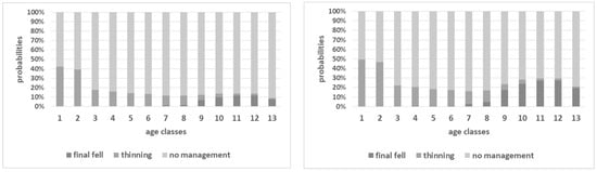 Activity probabilities according to the age classes—state forest (on the right) and other forest ownership types (on the left).