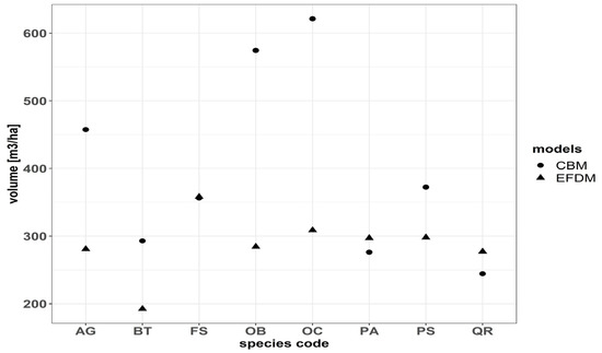 Growing stock volume (m3*ha−1): comparison between the two models EFDM and CBM-CFS3.