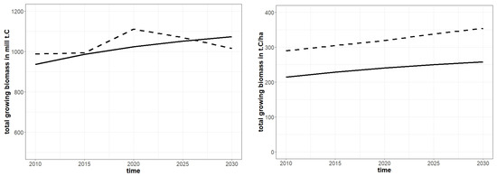 Total growing biomass calculated by both tools, reported in t.C. 106 (on the left) and t.C.*ha−1 (on the right). EFDM projections represented by dashed line, CBM-CFS3—solid line.