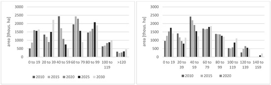 where Wi was the harvest intensity indicator for final felling and thinning in the given i-th age class, Ui was volume of harvested logs for final felling and thinning in the i-th age class, and Vi was volume of logs in the given i-th age class at the beginning of the period. When creating the probabilities, the indicators predicted for the period 2010–2019 were taken into account. It was assumed that final felling was increasingly often carried out in older than in younger stands, while thinning was mostly carried out in younger age classes.