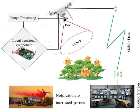 For humans, forests provide a variety of wealth and play an essential role in living. Forests are also considered our planet’s lungs; they filter the air by adding oxygen (O) and lowering carbon dioxide (CO) levels. Additionally, they purify the water from the majority of pollution-causing agents. Over the last few years, forest fires are becoming a kind of natural tragedy for the forest lands and wild habitats and severely affecting the ecosystem. In 2018, a forest fire in California destroyed over 150,000 acres, leaving 85 people dead and about 1000 people missing [1]. Wildfire outbreaks occurred in eastern Australia, in New South Wales and Victoria, in September 2019. The fires continued for over five months, destroying 5.8 million hectares of forest, and killing nearly 3 billion animals, and at least 23 people [2]. According to statistics from the European Forest Fire Information System [3,4,5], fires destroyed 4260 hectares of forest land in Spain, more than 150,000 in Italy, and 93,600 in Greece, in 2021. These occurrences resulted in the death of people and animals and significant damage to the environmental and financial infrastructures. Hence, the time spent detecting accurate sources of wildfire after ignition and alerting related agencies and officers is vital. It can help extinguish fires quickly and reduce, or even avoid altogether, the loss of forest resources.