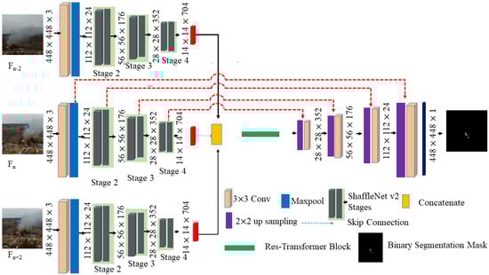 In this section, we discuss the FFS-UNet, which was based on the classic UNet [43] segmentation network, as shown in Figure 2. First, we extracted a keyframe and two reference frames using different encoder paths in parallel to obtain shallow features and perform the feature fusion. Then, we used a transformer to perform deep feature extraction, enhancing the feature learning of the fire pixels and making the feature extraction more robust. Finally, we combined the shallow features for de-convolution in the decoder path to segment the fire.