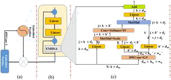 EMHSA: A component of the REST is depicted in Figure 4, which was used to compute the attention operation for the individual elements of the input . For this purpose, it yielded three values , , and , through trainable weight matrices , , and , respectively.Similar to ViT, was obtained, but for the key and the value, first, the two-dimensional input sequence was rearranged (i.e., ) along the spatial dimension. Next, we applied a depth-wise Conv operation to decrease the dimensions of the feature map by a factor of r.After the spatial-squeezing, was rearranged back into a two-dimensional input token, i.e., . Then, was linearly transformed into two sets, i.e., and , to acquire the key and the value, respectively. Therefore, the whole operation of efficient self-attention was expressed by the following equation.