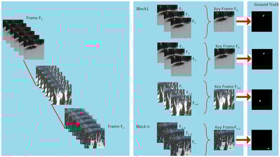 Collected UAV fire video dataset: No fire segmentation datasets of UAV video were large enough and publicly available. Therefore, we collected our data from various sources, including the ERA dataset [50] and the FLAME dataset [51]. From the ERA dataset, we selected 46 UAV videos (each with 150 frames and a spatial size of 640 × 640 pixels), of which 20 had fire scenes and the remaining did not. Furthermore, manually, we constructed ground-truth segmentation masks for each frame associated with fire. From the FLAME dataset, we selected 2 UAV videos (having 3840 × 2160 resolution); one was the fires of pile burns containing 2003 annotated frames. Figure 5 shows examples of the fire and non-fire frames.For FFS-UNet’s middle frame of the image series, was assumed to be the keyframe, and the other two reference frames were and , where n is the temporal length. For example, if n = 5, then the keyframe was . As discussed, 2 other frames, and , were supplied as the input to FFS-UNet for fire segmentation (Figure 6). We used one ground-truth mask for three inputs to maximize scenery variety. The number of samples is vital for training deep networks with reasonable accuracy. To satisfy the requirements of our investigation, we applied data augmentation by flipping the data to increase the sample size. The dataset was divided as follows: 80% to train and 20% to test our network.