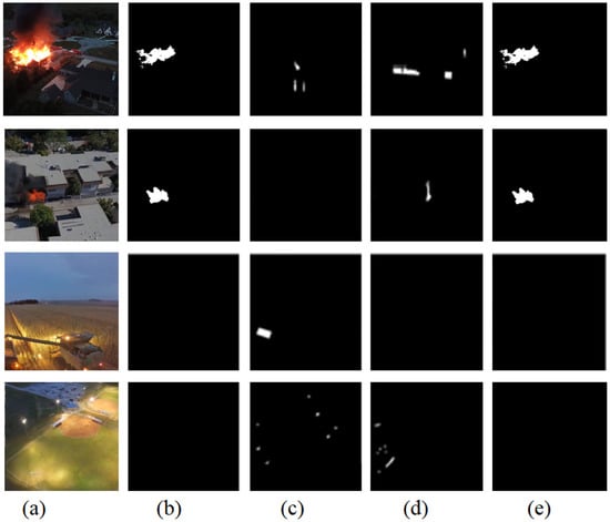 Qualitative comparison of the fire segmentation. From left: (a) images from the top two rows include fire and the bottom two rows are normal, (b) ground-truth, (c) single-stream encoder, (d) dual-stream encoder, (e) triple-stream encoder.