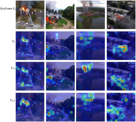 Attention map visualization of our model for fire pixels in keyframe , where we discovered the correlation with the other two reference frames in the temporal window (n). Columns 1–4 are shown as examples.