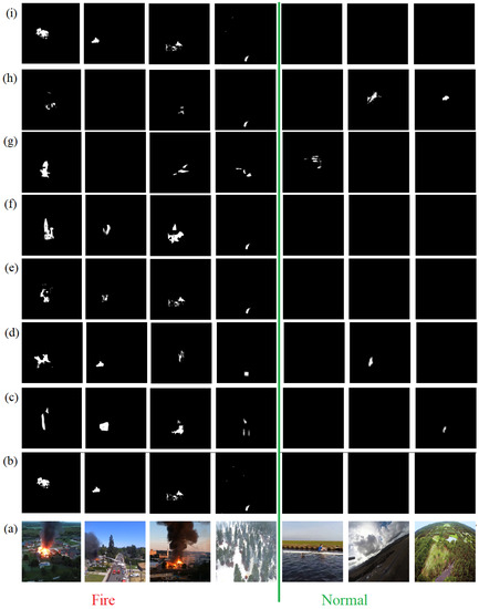 Qualitative comparison of the fire segmentation. From left: (a) first four are fire examples and the rest are normal, (b) corresponding ground-truth mask, and predicted masks by (c) TransUNet, (d) Swin-UNet, (e) STNet+DenseFire, (f) SegFormer, (g) Deeplabv3+ResNet50, (h) UNet, and (i) FFS-UNet.