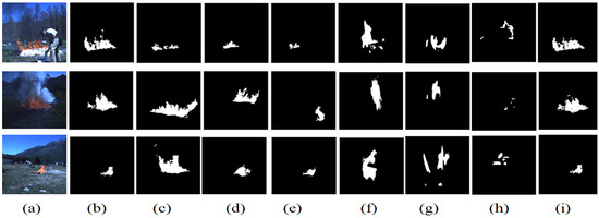 To further explore the significance of our technique, we utilized the method in [53] to visualize the attention maps rendered by our FFS-UNet on the collected dataset. Figure 8 depicts the attention map where each column was sampled from the same video, allowing the network to obtain helpful information that agreed with the fire ground-truth. FFS-UNet followed and segmented fire well under challenging conditions, such as (a) occlusion, (b) variations in locations, and (c) differentiating objects that appeared similar to fire.