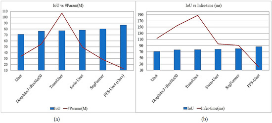 (a) Represents the relationship between the intersection-over-union (IoU) metric and the number of parameters (#Param (million (M))) of different models, and (b) represents the relationship between IoU and the inference time (i.e., the time duration of the model’s predictions) in milliseconds. The performance of the models varied as a function of these key variables.