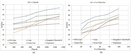 As shown in Figure 13a,b, we formed two training sets to better comprehend the effects of the temporal features and compare our FFS-UNet with transformer- and CNN-based forest-fire-segmentation methods: (a) training with the augmented dataset for 200, 500, 750, 1000, and 1300 epochs, and (b) training with 35%, 50%, 70%, and 100% datasets for 1300 epochs.As shown in Figure 13a, Deeplabv3+ResNet50 and UNet achieved an IoU of 0.713 and 0.76, respectively, after 1300 epochs while our FFS-UNet, after being trained for only 500 epochs, achieved a 78.7% IoU; it also outperformed Swin-UNet, which had been trained for all available epochs. Similarly, in Figure 13b, when the amount of training data was reduced, TransUNet showed the worst performance. Our approach, with 80% of the training examples, offered competitive performances, as compared to Swin-UNet and SegFormer, both of which had been trained on the entire training (100%) data. Therefore, explicitly learning fire features from a temporal transformer is more promising than implicitly learning from a single image.