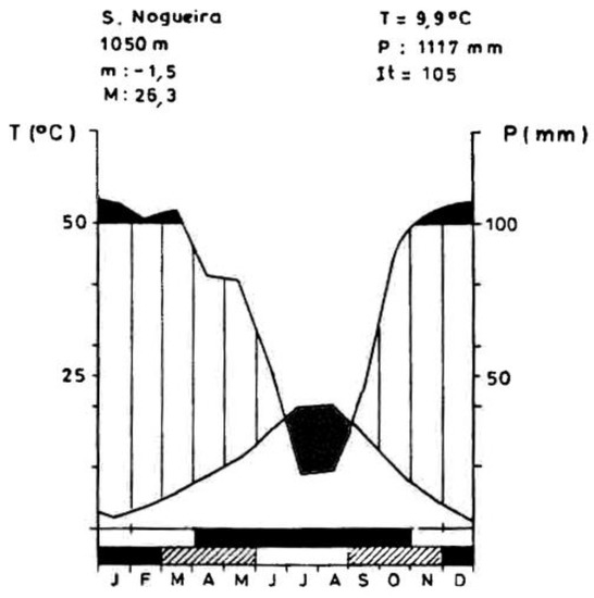 The experimental area is located in the Nogueira mountain, NE Portugal (41°44′ N, 6°51′ W). The site is situated at an elevation of 1140 m asl, SE exposure, and a slope ranging between 7 and 12°. The climate is Mediterranean with an annual precipitation of 1117 mm and a mean temperature of 9.9 °C, belonging to the supra-Mediterranean bioclimatic zone and humid ombroclimate (Figure 1). Geology is based on blastomilonites from the Precambrian polymetamorphic series [46,47]. The soil is a Cambissol with a loam texture, an average depth of 70 cm, and soil organic matter of 3.5%. The soil is slightly acidic with a pH (H2O) of 6.0. The area is dominated by oak woodlands belonging to the climatophilous vegetation of Holco mollis—Quercetum pyrenaicae Br-Bl P Silva & Rozeira, 1956. The study site is located in the Nogueira Mountain Forest Area under the management of the Forest Service (ICNF—Institute for Nature Conservation and Forests).