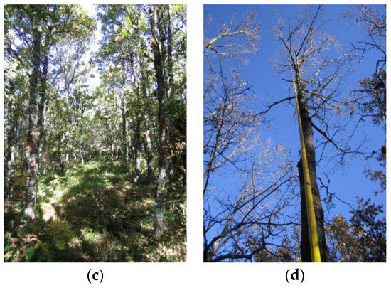 Conversion-of-Pyrenean-oak-coppice research trial. From left to right: overview of control plot (a), selective (b) and strip cutting (c), and tree height measurement (d). Images at installation age of 28 years.