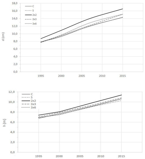 The study findings also allowed us to depict the time effect of the cutting treatments for this combination of species, site quality, and thinning, helping to define a relevant silvicultural issue related to the frequency or time interval of the interventions [40]. The diameter growth rate index indicates that, in general, it starts to decrease 12 years after thinning, while the 3 × 3 and 3 × 6 models have presented an extended period of growth response.