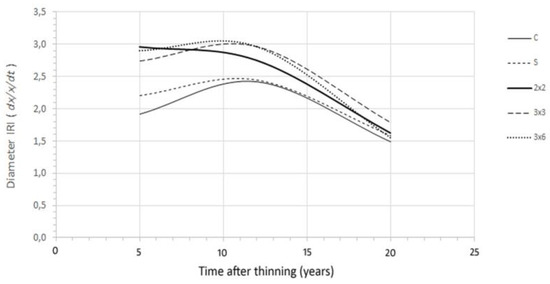In order to evaluate the time response of thinning on tree growth, an increment rate index (IRI) for diameter was computed as ꝺx/x/ꝺt, a derivate in relation to the initial tree diameter size over time (Figure 4). It can be seen that after the intervention, there was a quick response in tree growth, which extended, in general, for 12 years. The response has been shown to vary among treatments, with 3 × 3 and 3 × 6 being the ones with a longer extended period of growth.