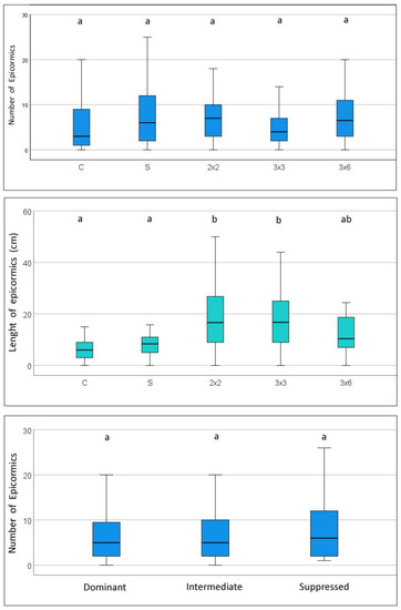 Number and length of epicormic branches of the trees at the end of the period for different treatments of Pyrenean oak coppice. Above: by treatment; below: by tree crown class. Box-plots with confidence intervals. Significant differences between treatments (p < 0.05) are shown with different letters.