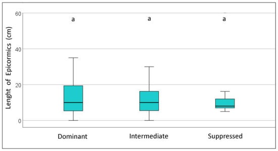 The presence and development of epicormic branches might be related to stem grading for certain specific wood end uses. Figure 5 presents the average differences concerning the number and length of epicormic branches. The results reveal that the number of epicormic branches is not significantly different among the treatments, averaging between 5.2 tree−1 (C) to 8.4 tree−1 (S). The number of epicormic branches varies widely within each plot, from tree to tree, with a large standard deviation within each treatment (coefficient of variation ranging from 80 to 110%), and several trees do not present any epicormic branches. Regarding the length of these branches, the control shows the lowest values (7.2 cm on average) whereas the strip treatments present the longer growth of the epicormics, although 3 × 6 (11.9 cm) was shorter than 2 × 2 and 3 × 3 and not significantly different from the control and selective cutting (10.4 cm). It was also observed that most of the smaller epicormics, up to 15 cm in length, usually tend to die in the short term. On average, both the number and the length of epicormics are not significantly different among the crown classes (Figure 5). The number of epicormics is slightly lower in dominant trees (6.3 tree−1) compared with intermediate (7.2 tree−1) and suppressed (8.9 tree−1), and the average length varies between 12.4 and 13.8 cm and is not significantly different.