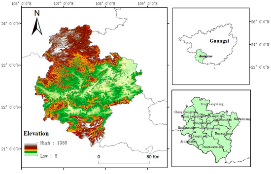 The Guangxi Paiyangshan Forest Farm (Figure 1), located in Ningming County, southwest Guangxi, China, near the border with China and Vietnam is the only large state-owned forestry field directly under the Forestry Department of Guangxi Autonomous Region bordering Vietnam, with a total land area of 28,096.29 hm2 and a forest land area of 27,462.28 hm2. The geographical coordinates are 106°30′–107°15′ E, 21°15′–22°30′ N. The southern red loam hilly area in China is a significant timber production region, with approximately 308,000 km2 of planted forests. PM, one of the primary fast-growing production species, is also a critical afforestation and deforestation species in southern China. It is the most widely distributed and largest area timber species in pine [14,15]. PM has outstanding features, including drought tolerance, ridge thinning resistance, strong growing ability, rapid growth, high quality, and versatility [16]. These qualities have great economic and ecological benefits [17,18], making PM an essential component in forestry production and forest restoration and reconstruction in China [19]. In this study, the Paiyangshan Forest Farm PM plantation is in the northern tropical case study area [20], which has an average annual temperature of 21.8 °C, an average annual rainfall of 1250–1700 mm, a rainy season from May to August, and a relative humidity of 82.5%. The annual number of sunshine hours is 1650.3, and the annual evaporation is 1423.3 mm. After years of afforestation, the native vegetation has been replaced by natural broad-leaved secondary forests and planted forests. The plantation forest tree species are mainly PM, Eucalyptus robusta, and Illicium verum.