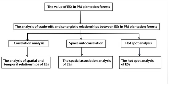 In this study, we employed correlation analysis, bivariate spatial autocorrelation analysis, and hot spot analysis to explore the relationship between the ES values of the PM plantations in Guangxi Paiyangshan Forest Farm [20]. The research framework is illustrated in Figure 2.