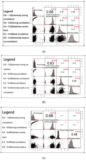 In this study, we employed Pearson correlation analysis to investigate the interactions among ESs in PM plantation forests. Pearson correlation analysis is a commonly used method for analyzing relationships among ESs [26,27]. We then used the chart.Correlation function in the R language software to explore the interrelationships among the four major forest services and each sub-forest of the PM plantation, and created a scatter plot matrix. When the correlation coefficient of a pair of ESs is significantly positive, it indicates a synergistic relationship between the services. Conversely, a significantly negative correlation coefficient indicates a trade-off relationship between the services. If the correlation is not significant, then there is spatial compatibility between the services. The strength of the correlation is determined by the absolute value of the correlation coefficient. A correlation coefficient in the range of (0, 0.3) indicates a weak correlation, that in the range of [0.3, 0.5) indicates a moderately strong correlation, and that in the range of [0.5, 1] indicates a strong correlation [28,29].