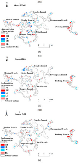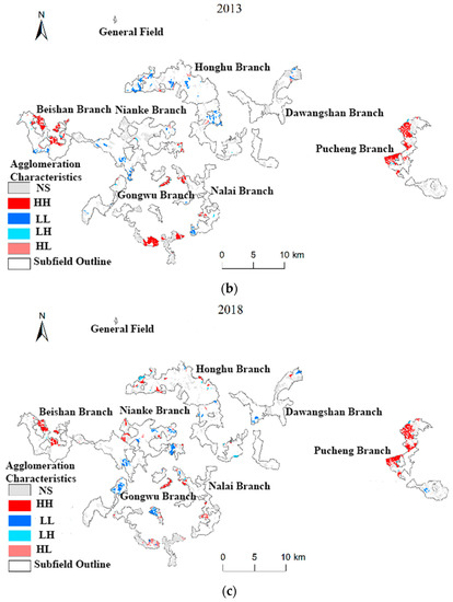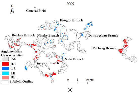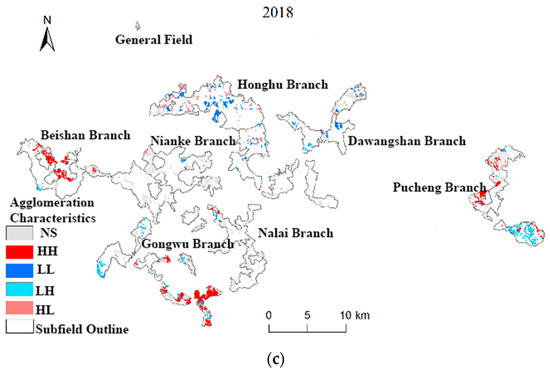 The Local LISA map shows the relationship between wood supply and water conservation services in PM plantations in Paiyangshan Forest Farm from 2009 to 2018. The map is categorized into NS (not significantly clustered), HH (high–high clustering), LL (low–low agglomeration), LH (low–high agglomeration), and HL (high–low agglomeration). We present three LISA maps: (a) the map of wood supply and water conservation services in 2009, (b) the map of wood supply and water conservation services in 2013, and (c) the map of wood supply and water conservation services in 2018.