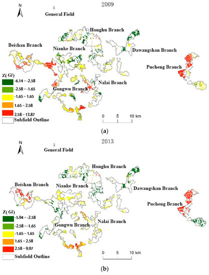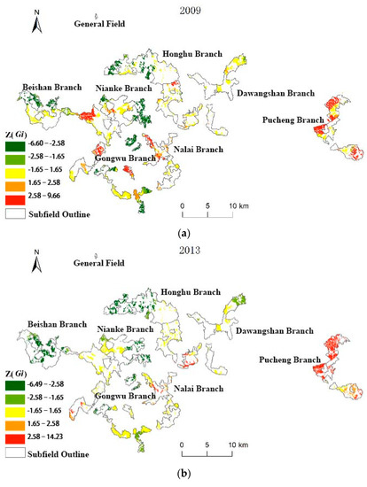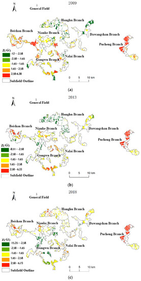 Distribution of cold–hot spots of carbon sequestration and oxygen release in PM Plantations in Paiyangshan Forest Farm from 2009 to 2018. Z(Gi*) is the aggregation index degree parameter. Red indicates a hot spot region, orange indicates a sub-hot spot region, yellow indicates an insignificant region, dark green indicates a cold spot region, and light green indicates a sub-cold spot region. The distribution of cold–hot spots of carbon sequestration and oxygen release is shown for the years 2009 (a), 2013 (b), and 2018 (c) in the following figures.