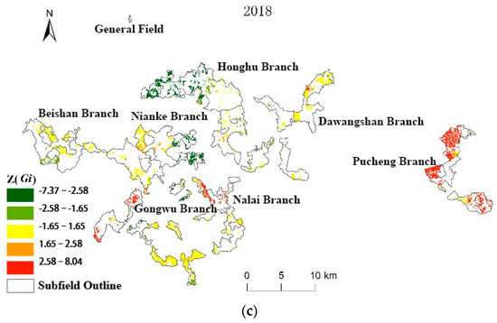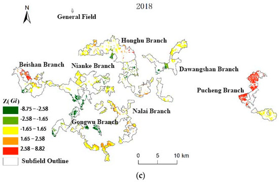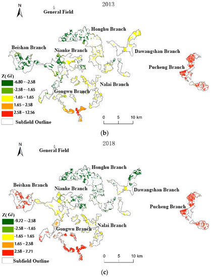 The distribution of cold–hot spots of soil conservation for PM plantations in Paiyangshan Forest Farm from 2009 to 2018 is presented in this figure. The aggregation index degree parameter is denoted by Z(Gi*). The color red represents hot spot regions, orange represents sub-hot spot regions, yellow indicates insignificant regions, dark green denotes cold spot regions, and light green indicates sub-cold spot regions. Panel (a) displays the distribution of cold–hot spots of soil conservation in 2009; panel (b) shows the distribution in 2013; and panel (c) depicts the distribution in 2018.