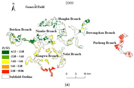 By combining Table 2 and Figure 8, we can observe that in 2009, there were 894 hot spots and 489 cold spots in the number of small groups with service values of carbon sequestration and oxygen release. The hot spots and sub-hot spots were concentrated in the central part of Beishan branch, the northwestern and eastern parts of Gongwu branch, and the northern part of Pucheng branch. Meanwhile, the cold spots and sub-cold spots were mainly distributed in the southern and southwestern ends of Gongwu branch, the northeastern part of Dawangshan branch, the northwestern part of Honghu branch, and Nalai branch. In 2013, the number of small groups of hot–cold spots for the value of carbon sequestration and oxygen release services decreased to 499 and 349, respectively, with the percentage of hot spots decreasing and the percentage of cold spots increasing. Compared with 2009, the hot spots decreased in the southern part of Beishan branch but increased in the northern part of Beishan branch and the northwestern part of Gongwu branch. Meanwhile, the number of small groups of cold spots mainly in the western part of Gongwu branch and Dawangshan branch decreased, but that in the southern part of the Gongwu branch increased. In 2018, there were 583 hot–cold spots of the value of carbon sequestration and oxygen release services, with 338 being cold spots. The percentage of hot and sub-hot distribution areas decreased, but the distribution range changed. The hot spot area of the value of carbon sequestration and oxygen release appeared in Honghu branch, and the distribution range of cold spots and sub-cold spots changed significantly. In 2013, the percentage of small classes of cold spots was mainly concentrated in the eastern part of Gongwu branch and Nianke branch, and there were no cold spots in Honghu branch and Beishan branch. However, the percentage of cold spots for carbon sequestration and oxygen release services increased and then decreased from 2009 to 2018, while the percentage of hot spots continued to decrease. Overall, from 2009 to 2018, the distribution pattern of the entire forest value volume changed to high east–west and low middle.