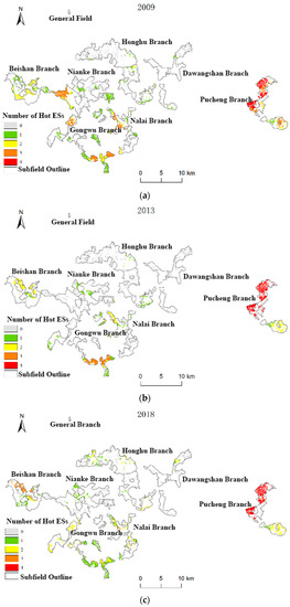 Number of hot spot ESs in PM plantations in Guangxi Paiyangshan Forest Farm from 2009 to 2018: (a) 2009; (b) 2013; (c) 2018.