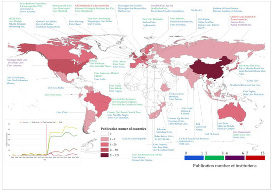 Based on the organization of the first authors, the organization distribution analysis was carried out. There was a wide range of research institutions (303 in total), but the chart space was limited. Therefore, only the top three organizations of each country were listed here. Among them, the top 10 institutions are Chinese Acad Sci Res Ctr Ecoenvironm Sci, UFZ Helmholtz Ctr Environm Res, Yunnan Univ, Michigan State Univ, Beijing Normal Univ, Iowa State Univ, Swedish Univ Agr Sci, Univ Queensland, Univ Vermont, and Henan Univ. Universities occupied most of the research institutions, indicating that the education organizations paid more attention to ES drivers. Judging from the individual author, the top 10 contributors to the number of publications on the topic are Ricketts Taylor H (5), Sonter Laura J (5), Polasky Stephen (4), Watson Keri B (4), Woodward Guy (4), Ding Shengyan (3), Xue Fengzhi (3), Fu Bojie (3), Wen Zhi (3), Yu Dandan.