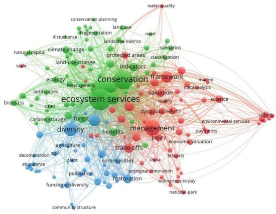 Keywords are the condensed key information of a paper, and we can determine the research focuses of each field by analyzing the keywords. A co-occurrence network clustering analysis was performed using the keywords of 408 publications (Figure 3). Each keyword must appear in at least 5 publications or will not be counted; a total of 162 keywords were extracted. The larger the label and shape in the figure, the higher the frequency of the keyword, and the thickness of the connecting line is proportional to the co-occurrence frequency of the keyword. The most frequently used keywords were ecosystem services (150), conservation (125), biodiversity (97), management (81), diversity (62), climate change (49). It can be seen in the figure that cluster 1 (green) is centered on ES, with conservation, biodiversity, patterns, etc., as auxiliary research; cluster 2 (blue) focuses on diversity and land use; cluster 3 (red) pays close attention to management and values. In addition, keywords such as climate change, natural capital, and agriculture were widely used.