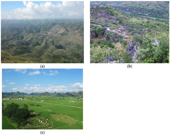 Comparison of landscapes configured by different patches in Guizhou, China: (a) Single patch configuration landscape with karst desertification. (b) Small vegetation patches and large stone patches in the process of ecological restoration. (c) Multiple patch configuration landscape without desertification. (Source of the pictures: Photoed by Kangning Xiong.).