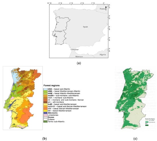 Study area: (a) Geographic location, (b) Forest regions for mainland Portugal [19], and (c) Maritime pine potential empirical distribution [25]. Legend: Forest regions of Maritime pine occurrence (in bold)—bMA—basal (0–400 m) Mediterranean–Atlantic; bAM—basal (0–400 m) Atlantic–Mediterranean; bsM—basal (0–400 m) sub-Mediterranean; bSA—basa l (0–400 m) Sub-Atlantic; and smSA—sub-montane (400–700 m) sub-Atlantic.