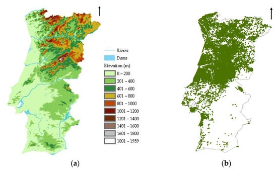 The study area is mainland Portugal (36.9636° N 9.4944° W and 42.1543° N 6.1892° W), located in the Iberian Peninsula (Figure 1a). The annual temperature ranges from about 7 °C in the northern and central inland highlands to about 18 °C on the south coast. The average annual precipitation has the highest values in the north and northwest regions and the lowest values in the south and inland. The study area includes two climate classifications: (i) Hot-summer Mediterranean in the south and central inland and lower elevations (below 800 m); and (ii) Temperate Mediterranean in the north and northwest region of the country and higher elevations (above 800 m) [33].