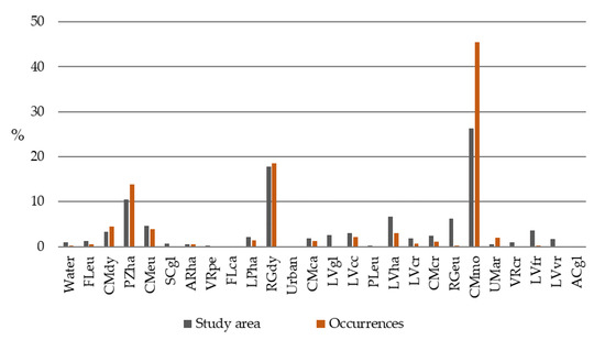 Soil codes (WRBFU) in the study area and in Maritime pine occurrences.