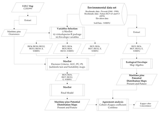 Consequently, this research’s working hypothesis was that the species distribution modelling (SDM by ML MaxEnt algorithm) and the ecological envelope approaches are complementary methodologies. The aims of this study were the following: (1) to model Maritime pine potential distributions for the present and for the future in 2070 under two climate change scenarios (e.g., RCP 4.5 and RCP 8.5) using the MaxEnt; (2) to update the species ecological envelope maps with the same environmental data set and climate change scenarios; and (3) to perform an agreement analysis for the species distribution maps produced with the MaxEnt and the ecological envelopes.
