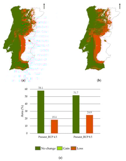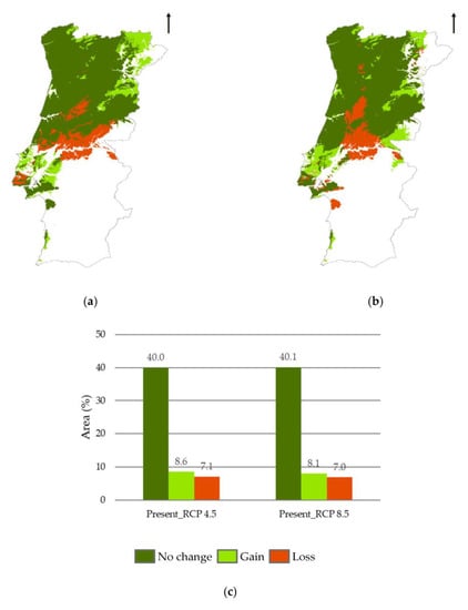 Ecological envelope—Maritime pine distribution area changes under the climate change scenarios: (a) Present to future 2070 under RCP 4.5 climate change scenario; (b) Present to future 2070 under RCP 8.5 climate change scenario; and (c) No change, gains, and losses areas (%) between present and future.