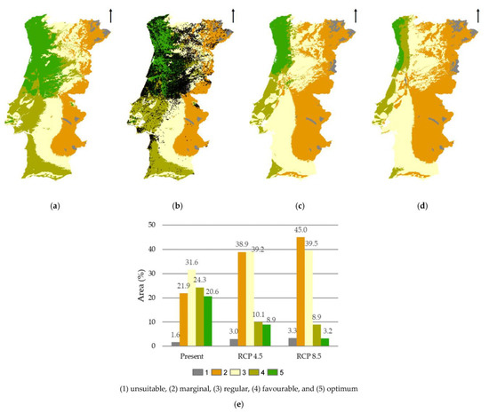 MaxEnt—Maritime pine potential distributions for the present and for the future under climate change scenarios: (a) Present; (b) Present with the species’ occurrences (black dots); (c) Future 2070—RCP 4.5; (d) Future 2070—RCP 8.5; and (e) Suitability areas (%) in the present and for the future (2070) under the RCP 8.5 and RCP 8.5 climate change scenarios.