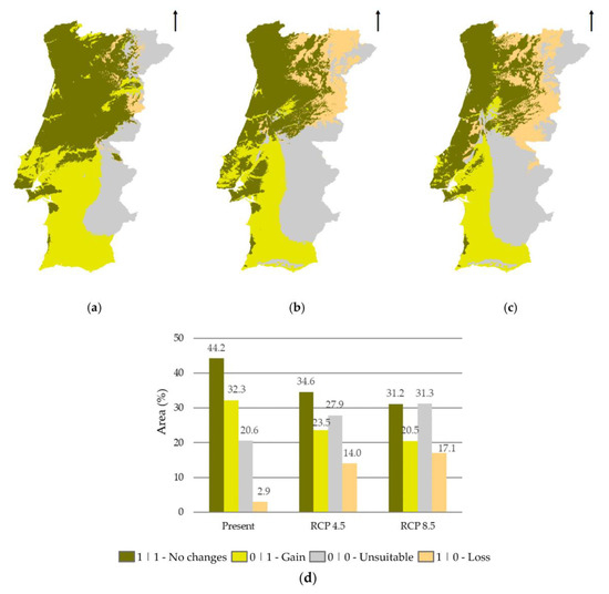 MaxEnt vs. ecological envelope—Maritime pine’s presence–absence maps combined: (a) Present; (b) Future (2070)—RCP 4.5; (c) Future (2070)—RCP 8.5; and (d) No changes, gain, unsuitable and loss areas (%).
