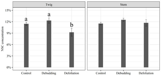 Responses of concentrations of NSC, soluble sugar, and starch in stems and twigs of seedlings to defoliation and debudding treatments in one year. The results are shown as the mean ± standard error. The mean values of each treatment are the average of 5–10 replications (5 replications for defoliation, 8 replications for debudding, and 10 replications for control). Significant differences are denoted with different lowercase letters.
