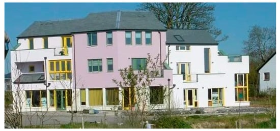 The Ecovillage at Cloughjordan in County Tipperary, Ireland, is the country’s only ecovillage and has become one of Ireland’s leading focal points for modelling sustainable development. The residents of the Ecovillage strive to both promote and demonstrate ways of achieving low-carbon living using the three pillars of ecological building standards, district heating, and its community farm food system []. Through ongoing projects, the Ecovillage community aim to transition to a lower-carbon future lifestyle and thereby contribute to national and international efforts to tackle climate change and offer an alternative model for housing and sustainable living []. The An Corrán building is a timber-framed terrace of three units combining ground-floor workplaces with residences above, with a total of 469 m2 in gross internal floor area (GIFA), designed and constructed with sustainability as a central focus (Figure 1).