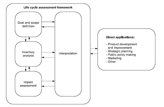 The ISO 14040 [] and 14044 [] standards for the life cycle assessment (LCA) methodology of environmental management define the four main phases of LCA studies (Figure 2), as follows: