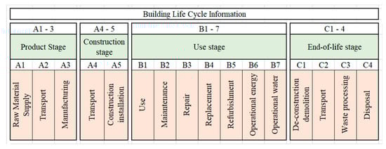 The European EN15978 standard [] for calculating the sustainability of a building’s construction, divides the building’s life cycle into 4 stages (i.e., Product, Construction, Use, and End-of-life), and 16 sub-stages to facilitate the assessment and attribution of the environmental impacts to the appropriate life cycle stage and sub-stage (Figure 3). It also helps to identify the most and least significant life cycle stages contributing to the overall environmental impacts [].