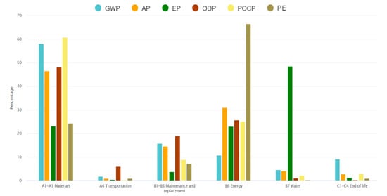 The OCL tool groups some of the LCIA results by the life cycle stages (e.g., A1–A3, B1–B5) (Figure 4). These results show that apart from the 67% of the PE and 49% of the EP-related emissions produced by the operational energy (B6) and water usage (B7) stages of the An Corrán building’s life cycle, the A1–A3 stages are responsible for the largest percentage of the other environmental impacts (i.e., GWP, AP, ODP, and POCP) (Figure 4). The supply of raw materials, their transport to the manufacturing site, and the manufacturing processes for the materials used in the building account for 58% of the GWP and 61% of the POCP-related emissions during the A1–A3 life cycle stages. The next most significant contributors to the environmental impacts are the energy supply (B6) and maintenance and material replacement phases (B1–B5) of the building’s life cycle.