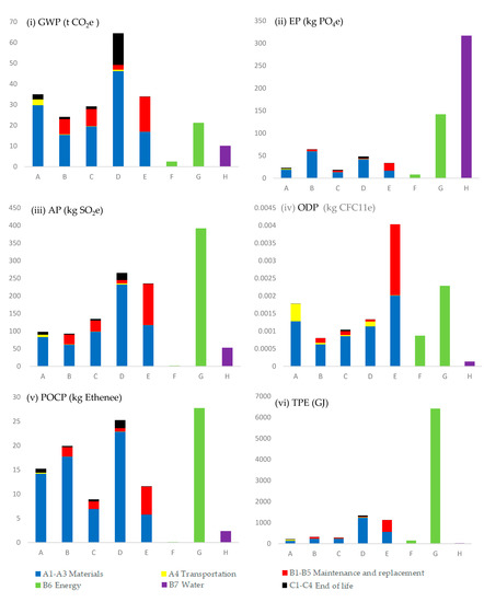 The NOx and VOCs released during the combustion of the heating fuels (G) are also the main sources of the POCP impact emissions, i.e., 28 kg Ethenee, while the Product (A1–A3), and Maintenance and Replacement (B1–B5) Stages of the materials used in the floor slabs, ceilings, beams, and roof (D) account for the next largest contribution of 24 kg Ethenee (Figure 5v). The lifetime use of electricity from renewable sources (F) and total water consumption (G) are the lowest contributors to the POCP impact, with 0.11 and 2.4 kg Ethenee, respectively. Finally, the total primary energy (PE) results are dominated by the fuels used for the district heating system (G), which accounts for 6.4M MJ, or 65% of the total 9.9M MJ of PE used, with the horizontal structural elements of the building (D) being the next most significant contributor (i.e., 14%) to the whole life cycle PE results (Figure 5vi).