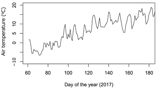 Air temperature, soil temperature, soil moisture, and soil inorganic N contents were monitored as abiotic environmental factors. The air temperature was measured every 1 h at the climate station within the nursery from March to June 2017. For the soil temperature and moisture, every 1 h, we started to measure soon after the snowmelt timing in snowmelt plots at 10 cm in soil depth by using digital TDT moisture and temperature sensors (SDI-12, Acclima, Meridian, ID, USA). By using the hourly data, the daily average was calculated for each day. The soil moisture at 10 cm in depth is known to change sensitively to snowmelt [14], and roots are abundantly distributed in our region [30].