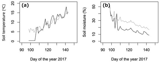 The daily average soil temperature (a) and moisture (b) from April to May 2017. Black line = control (Con) plots and gray line = snowmelt (SM) plots. The data are the average value of two sensors.