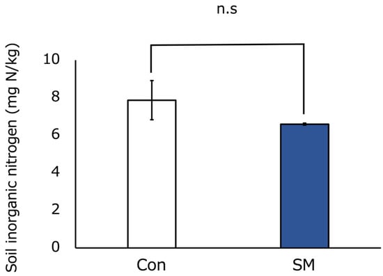 For soil inorganic N (the sum of NH4+ and NO3−N), three subsamples were obtained from each plot to 10 cm in depth to make a composite in each plot. This composite of soil was sieved with a 4.75 mm sieve to remove the roots and stones from the soil and homogenize the soil. The sieved soil (8 g) was shaken with 40 mL of 2 M KCl over 1 h and filtered with filter paper. The contents of NH4+ and NO3−N in the filtered solution were measured with an autoanalyzer (AACS-4, BL-TEC Co., Ltd., Osaka, Japan). The contents of inorganic N in a certain amount of dry soil were calculated based on the soil moisture content.