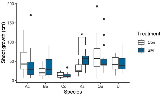 The shoot growth of six tree species in June 2017 as influenced by the snowmelt treatment. The white boxes represent the data of the control (Con) and the blue boxes represent the snowmelt (SM) treatment. (n > 9). Ac = Acer mono, Be = Betula platyphylla, Co = Cornus controversa, Ka = Kalopanax septemlobus, Qu = Quercus crispula, and Ul = Ulmus davidiana. *: p < 0.05 by GLMM (for K. septemlobus, GLM analysis).